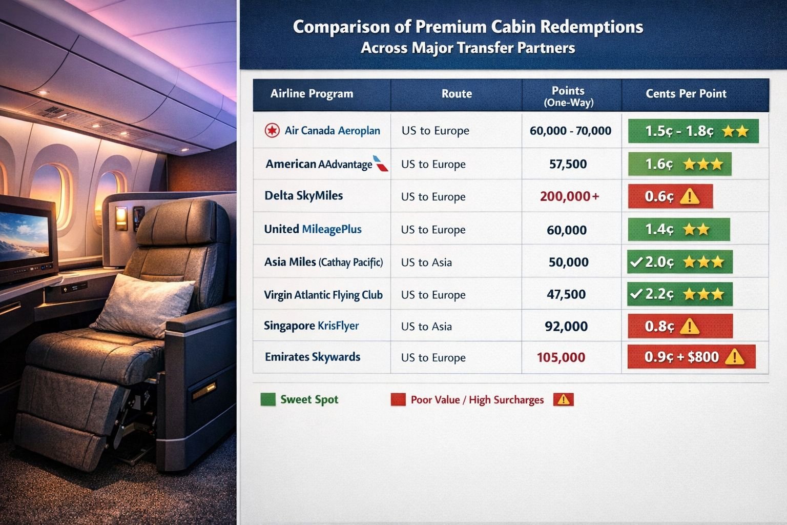 - Good value: 1.5-2.5 CPP (solid for premium economy and business)